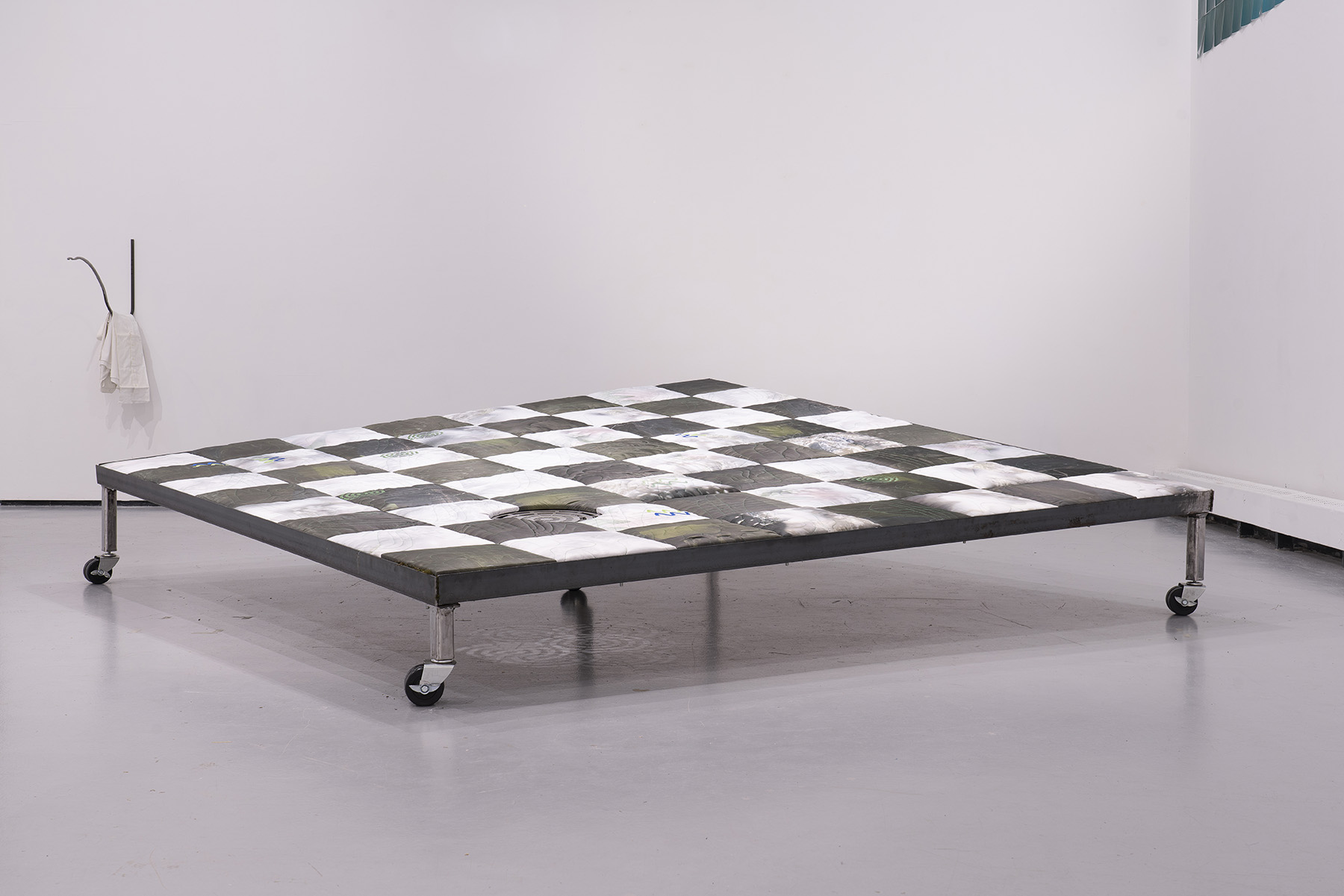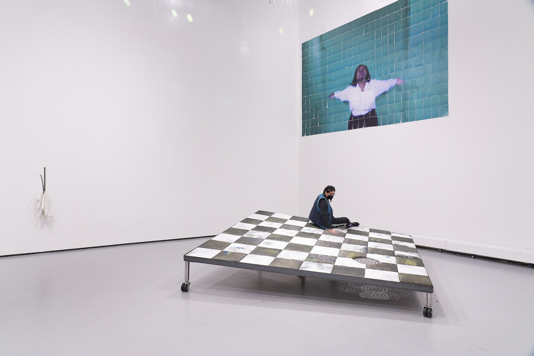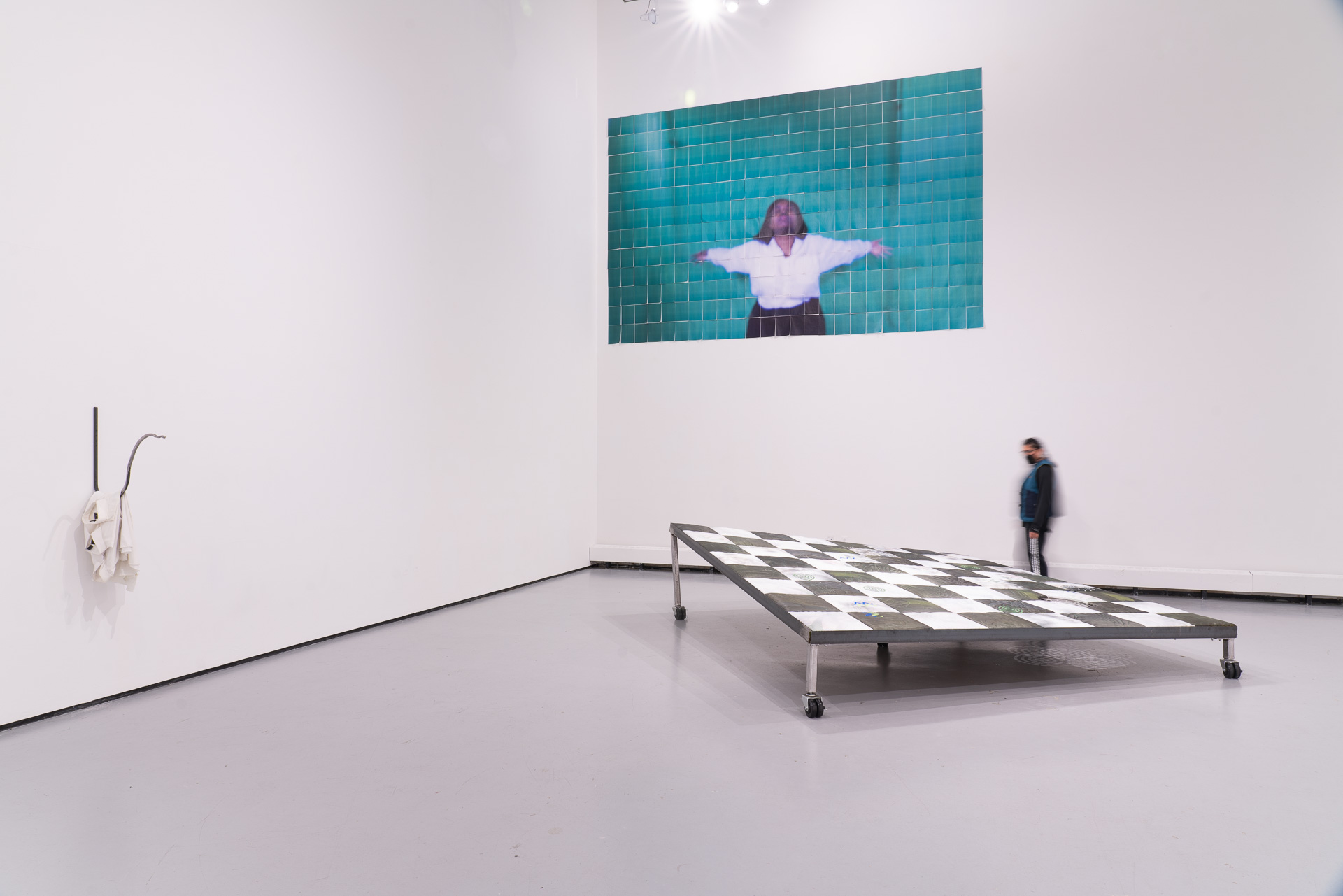 Ross’s installation is alive with affectionate human entanglement, ripe with the tantalizing uncertainty induced by chance encounters. On this platform of intimate relation and under darkness, whether a bed, a dance floor, or a gameboard, the next question remains the same: “whose move?”