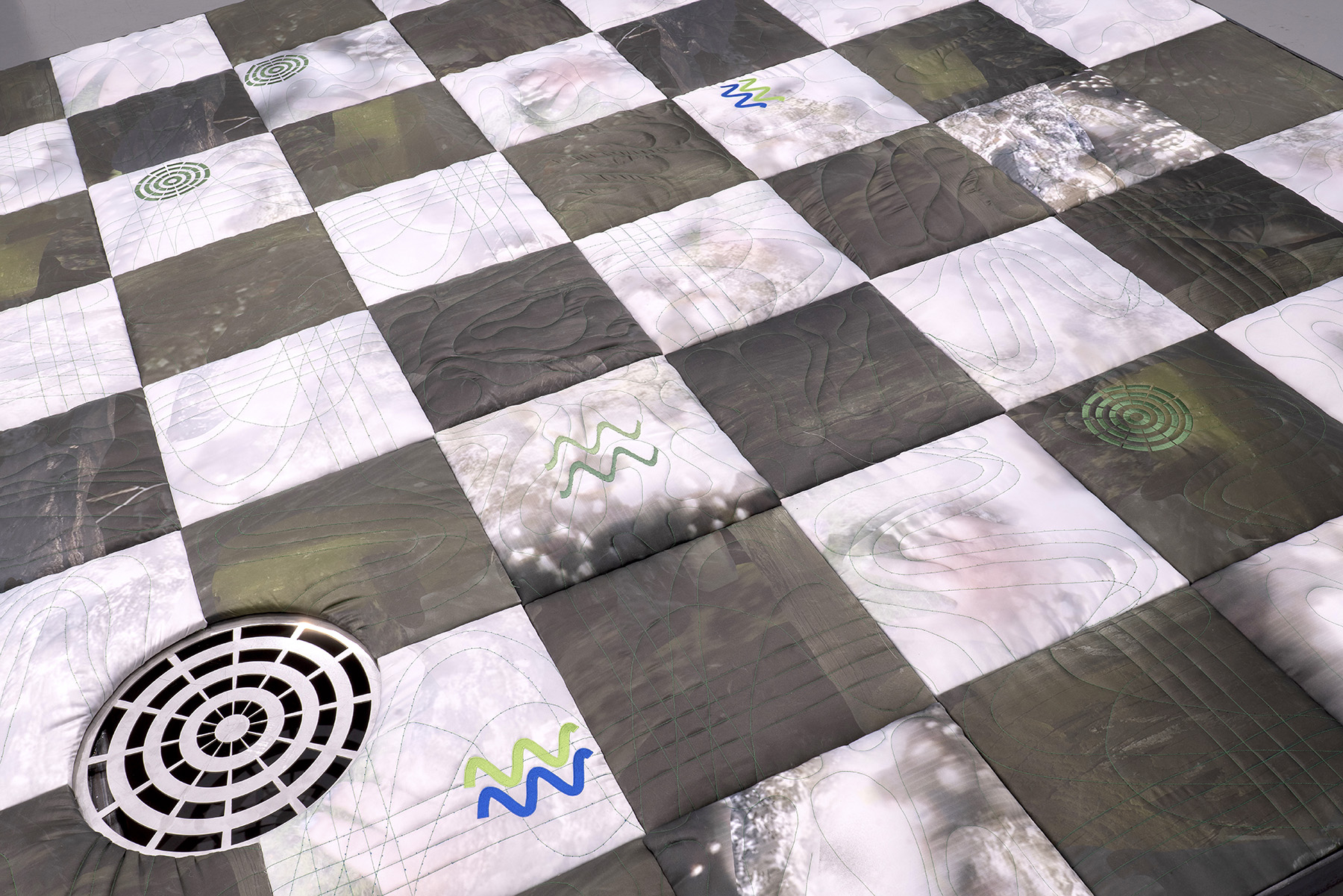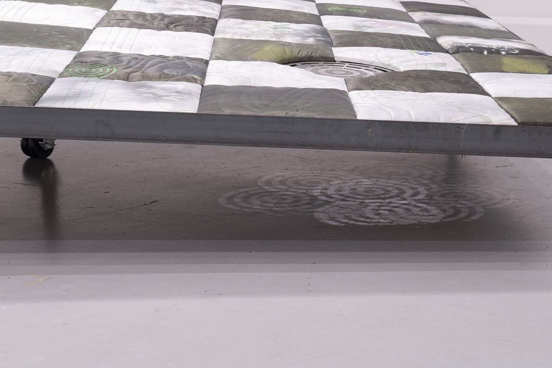 Whereas digital renderings are the cybernated media of our present and future, quilting is an ancient labor. Over time, this patient practice has been subject to gendered and classed markings — “feminized,” “functional,” “folk.” Ross’s digitally-printed fabrics suggest that quilting is a technology, domestic ingenuity that meets our needs for warmth as well as ornamental decadence, muddling the line between function and desire.