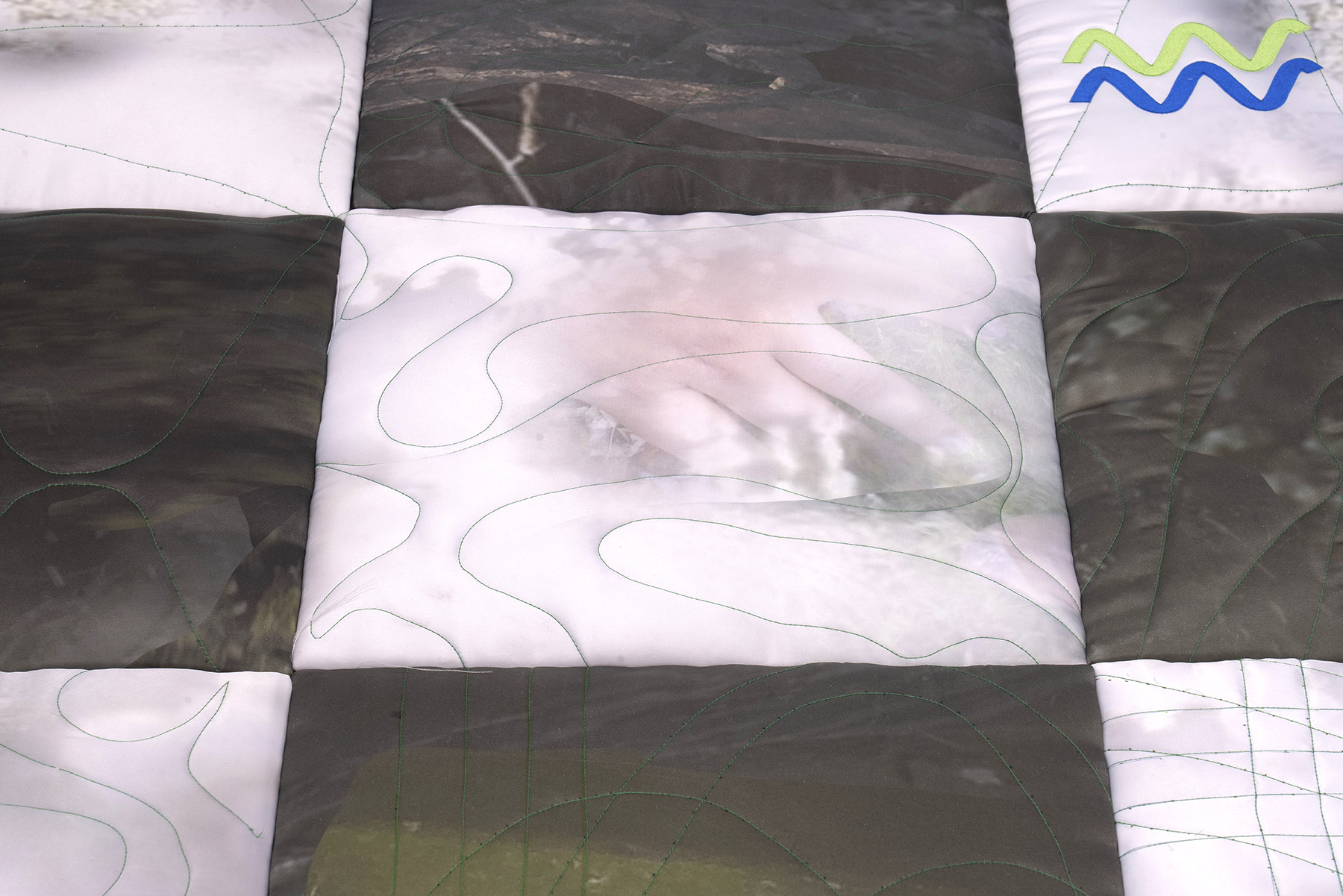 A child’s voice haunts the space with such poetic overtures: “Living inside the specter of the present we go to war everyday and still find ways to be together.” Here, the mechanisms of quilting reveal a takeaway: through violent puncture, a needle sutures two soft pieces together. We find our needle and our stray pieces and we yoke them.